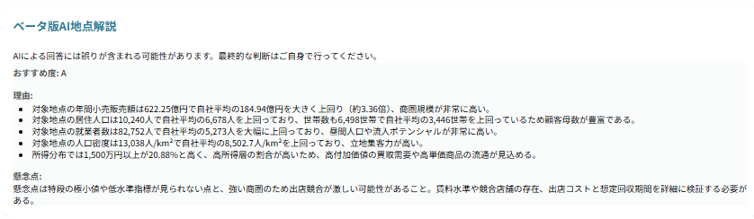 分析対象の地点について、AIが「おすすめ度」「おすすめ理由」「懸念点」を自動で解説します。
