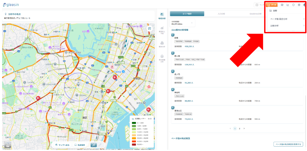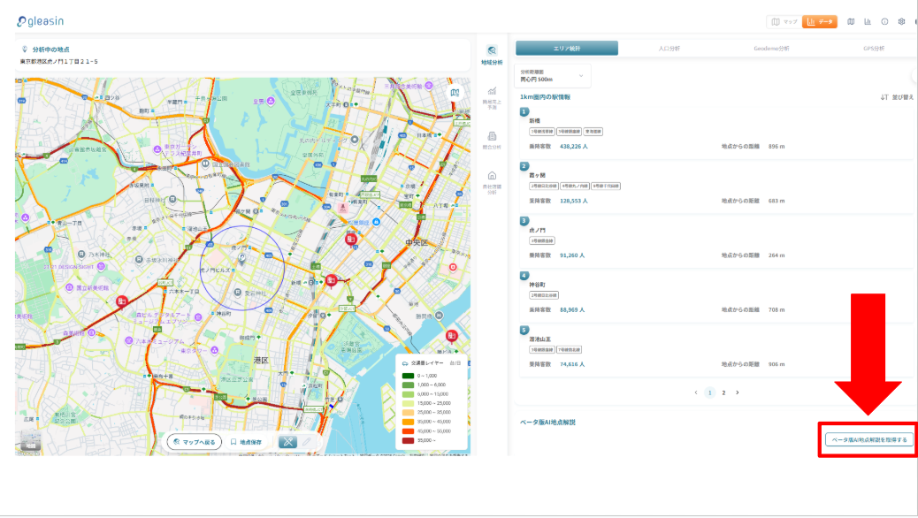 A. 地点の分析結果画面に「AI解説を見る」ボタンが追加されています。クリックするとおすすめ度・理由・懸念点が表示されます。