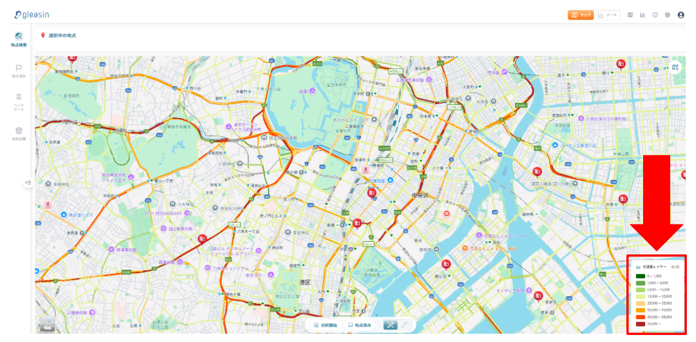 従来より細かい区分で交通量の差を色分け表示できるようになりました。近隣エリアとの微妙な違いも視覚的に把握しやすくなっています。